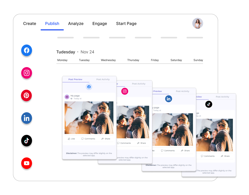 Schedule your Instagram post to go live across Instagram, Twitter, Pinterest, LinkedIn, TikTok, and YouTube, all at once, from one place.